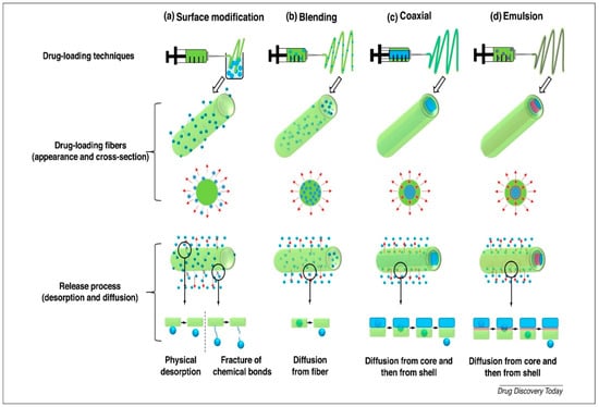 Drug loading and release (desorption and diffusion) from polymeric micro/nanofibers fabricated by (a) surface modification; (b) blending; (c) coaxial; and (d) emulsion electrospinning. The green color stands for the polymer, blue for drugs, and maroon for the surfactant. The red arrows represent the direction of the drug release. Reproduced with permission from []. Elsevier, 2017.