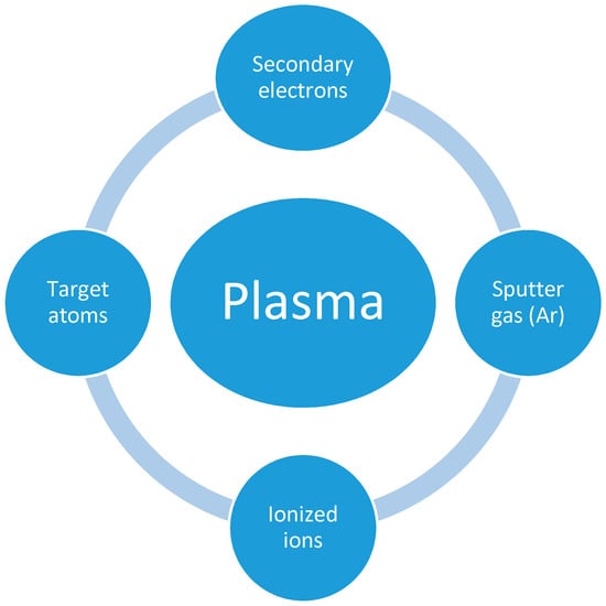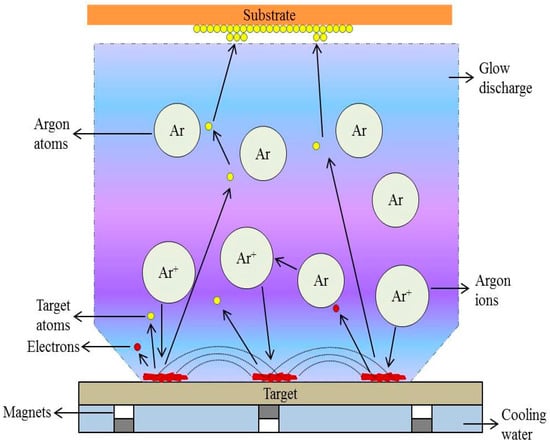 Sputtering is the ejection of atoms by the bombardment of a liquid or solid target by energetic particles, typically ions []. These ejected atoms are then deposited on the substrate []. Figure 5 presents a schematic representation of sputtering technology. Argon gas is commonly used as a sputtering gas. The ejected fragments are accumulated on the substrate by adjusting the distance between the target and substrate. The number of atoms excited from the surface per incident ion is known as sputtering yield, ‘S’. The value of S depends on many parameters, including target material composition, experimental geometry, binding energy, and the properties of incident ions. In addition, there are also experimental parameters, such as voltage and current. In a conventional sputtering machine, the cathode is connected to the target and the anode is connected to the substrate, with the plasma in between them.
