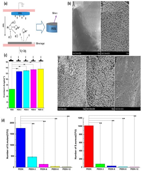 - Liu, X.; Gan, K.; Liu, H.; Song, X.; Chen, T.; Liu, C. Antibacterial properties of nano-silver coated PEEK prepared through magnetron sputtering. Dent. Mater. 2017, 33, e348–e360. [Google Scholar] [CrossRef] [PubMed]