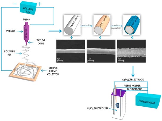 Electro-conducting polymers such as polypyrrole (PPy), polyaniline (PANI), polythiophene (PT), poly(3,4-ethylene dioxythiophene) (PEDOT)) show attractive electrical and optical phenomena. Thus, they have been researched in the past few decades for various applications such as microelectronics, actuators and polymer batteries []. Electro-conducting polymers that possess the advantages of biocompatibility and good conductivity can be applied as biosensors and tissue engineering scaffolds []. Electrospun electro-conductive polymers are an excellent tool for electrically stimulating neurons and for nerve tissue engineering, as well as for application in neural prostheses for therapeutical function [,,]. Schmidt et al. first studied PC12 cells using the polypyrrole (PPy) electroconductive polymer, recognizing the growth of PC12 cells on the PPy thin film, they enhanced the neurite outgrowth from the cells; these results suggest significant application of these type of scaffolds for nerve tissue regeneration []. Many studies have proposed the improvement of the electro-conducting polymer for nerve tissue regeneration applications by adding cell adhesive [], neurotrophins [], and topographical features []. Jae Y Lee prepared electrospun nanofibers coated with the conductive polymer PPy for nerve tissue engineering applications []. PPy-PLGA showed improved growth of rat pheochromocytoma 12 PC12 cells and hippocampal neurons compared to non-coated PLGA as a control. This suggests that PPy-PLGA could be used for nerve tissue engineering applications. Simultaneously, electrical stimulus studies on the scaffold indicated that a stimulus of 10 mV/cm improved the neurites such that they were 40–50% longer, as well as exhibiting 40–90% greater neuron formation, compared to the same scaffolds with no stimulus. Moreover, aligned scaffolds show greater neurite elongation and formation than randomly oriented PPy-PLGA fiber scaffolds. The good results for electric stimulus suggest that biocompatible polymers prepared by electrospinning have significant advantages in biomedical applications such as nerve tissue engineering.