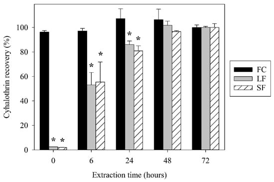 Recovery of total γ-cyhalothrin from FC, LF, and SF treatments at different extraction times. Bars represent standard error. * indicates significant difference from FC (p ≤ 0.05).