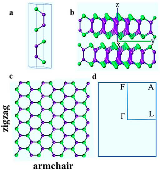 Bulk InSe can exist in three polytypes denoted as β, γ and ε phases, which show ABAB, ABCABC and ACAC stacking order, respectively. In this work, we focused on the most energetically favorable β-InSe phase, for which the 2DLM crystallizes to form hexagonal structure stacked in AB order, as is shown in Figure 1. The unit cell of β-InSe comprises a base-centered hexagonal lattice classified in the space group P63/mmc, number 194. From the experimental work [49], lattice constants are a = 4.05 Å, b = 4.05 Å, c = 16.93 Å.