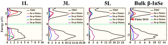 Calculated total density of states (TDOS) and partial density of states (PDOS) of β-InSe monolayer (1 L), few-layer (3 L and 5 L) and bulk β-InSe. The green horizontal dashed line represents Fermi energy level set to be 0 eV.