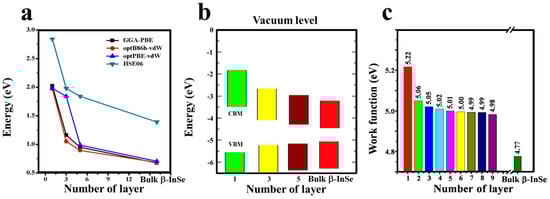 The β-InSe monolayer and few-layer showed that, the band gap values increase with decrease in the number of layers following a power law as depicted in Figure 4a, showing the variation in the electronic band gap as a function of the layer thickness of β-InSe based on various functionals. The alignments of conduction band minimum (CBM) and valence band maximum (VBM) wavefunctions with respect to the vacuum level are shown in Figure 4b for monolayer (1 L), few-layer β-InSe (3 L and 5 L) and bulk β-InSe, based on hybrid functional calculations. The positions of CBM and VBM for 1 L, 3 L, 5 L and bulk β-InSe are −3.5 eV, −4.0 eV, −4.1 eV, −4.3 eV and −5.5 eV, −3.2 eV, −5.1 eV, −5.0 eV, respectively. The general trend shows the VBM energies shift upwards as the numbers of layers increases and CBM shift downwards. The tuning of the VBM and CBM energies in β-InSe via layer control offers a practical option to optimize the Schottky barrier height, hence improve electron injection efficiency, which leads to more efficient electron mobility across the contact.