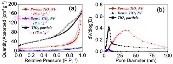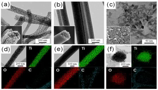 The morphological features of PTFs, DTFs, and TNPs were observed by FE-SEM and FE-TEM, as shown in Figure 1. Figure 1a shows PTF prepared using a spinning process, in which numerous pores in the structure were confirmed from the fiber surface and cross-sectioned inset image. The PS in the spinning solution was separated with PAN during electrospinning. Subsequently, PS in the as-spun fibers was decomposed into CO2 gas during heat treatment, which formed the numerous pores between TiO2 crystals in the structure. On the other hand, DTF fibers prepared from the solution without PS showed dense structure in Figure 1b. Without the effect of phase separation by adding PS, pores were not generated in the structure. Therefore, it was hard to observe any pores, even in the cross-sectioned inset image in Figure 1b. The mean fiber diameter of PTF and DTF measured from FE-TEM images were both 200 nm. From the elemental mapping images in Figure 1d,e, both TiO2 nanofibers showed uniformly distributed Ti and O elements over the nanostructure, but the C element was negligible, which proves the completely decomposition of C during heat treatment. The TNPs were rice-shaped and had an average particle size of about 30 nm (Figure 1c). Figure 1d–f shows the FETEM and EDX mapping results of the PTF, DTF, and TNP powders. The EDX mapping results show that only Ti and O were present in the samples. C was detected on the carbon tape used for the sampling. The EDX results also showed that the PTFs were less dense as compared to the DTFs. BET surface area measurements were carried out to determine the pore diameters and surface areas of the samples quantitatively.