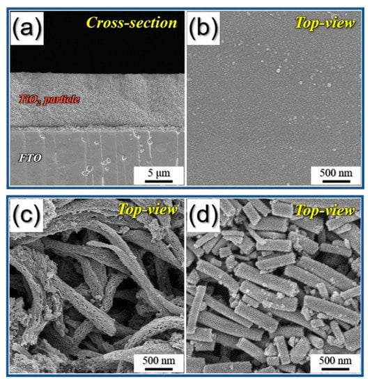 In this study, we prepared seven kinds of photoelectrodes, as shown in Scheme 1. The photoelectrodes with only TNP, PTFs, and DTFs were labeled as TNP, PTF, and DTF, respectively. The TNP photoelectrodes with 10 wt.% of PTFs and DTFs were denoted as TNP-PTF and TNP-DTF, respectively. The photoelectrodes with PTF and DTF light scattering layers were denoted as TNP/PTF and TNP/DTF, respectively.