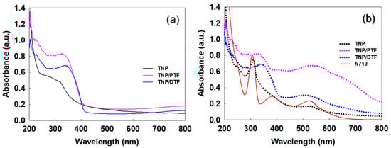 The UV-Vis absorption spectra of the TNP, TNP/DTF, TNP/PTF photoelectrodes, and N719 dye are shown in Figure 6. As shown in Figure 6a, all the samples showed strong absorption in the UV region (wavelengths lower than 250 nm) before dye adsorption. It can be observed that the absorption edges of the TNP/DTF and TNP/PTF photoelectrodes slightly red-shifted with respect to the TNP photoelectrode, suggesting that the TNP/DTF and TNP/PTF photoelectrodes caused a small decrease in the energy band gap. In addition, the TNP/DTF and TNP/PTF photoelectrodes showed an absorption peak in the near-UV region at 330 nm, which can be attributed to their rutile structure. All the samples showed almost no absorption in the visible region. As shown in Figure 6b, the N719 dye showed an absorption peak in the visible region at 530 nm. The intensity of this peak was high in the case of the TNP/PTF photoelectrode. This indicates that the use of the PTF light scattering layer (TNP/PTF) coating increased the visible region absorption of the DSSC.