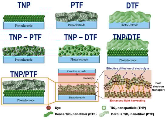 In summary, the PCE of DSSCs can be easily improved by altering the design of their photoelectrodes. In this study, we prepared seven TiO2 photoelectrodes to improve the PCE of DSSCs, as shown in Scheme 1. The TiO2 photoelectrodes were fabricated using TiO2 nanoparticles and the porous TiO2 nanofibers (PTFs), and dense TiO2 nanofibers (DTFs) were used as additives or light scattering layer. The PTFs and DTFs were prepared using simple electrospinning. TiO2 nanoparticles (TNPs) were prepared using a hydrothermal reaction and were used for fabricating the photoelectrodes. The as-prepared PTFs and DTFs were used as additives or were coated as light scattering layers to improve the charge transfer ability and light harvesting effect of the DSSCs.