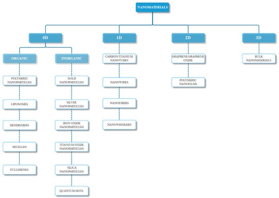 Nanomaterials classification based on their dimensionality (0D—zero-dimensional, 1D—one-dimensional, 2D—two-dimensional, 3D—three-dimensional).