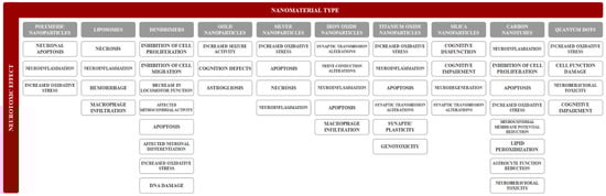 Neurotoxicity refers to any reversible or irreversible adverse effect on the structure, function, or chemistry of the nervous system, during development or at maturity, produced by physical or chemical causes. Moreover, an adverse effect represents any change caused by treatment administration that affects the normal function. Common neurological adverse effects (Figure 2) regarding morphological changes involve neuronopathy, axonopathy, myelinopathy, and gliopathy []. The main mechanisms for neurotoxicity involve the excessive production of reactive oxygen species leading to oxidative stress, the release of cytokines causing neuroinflammation, and dysregulations of apoptosis leading to neuronal death []. However, there is a considerable lack of information regarding the neurotoxicity of nanomaterials, which complicates risk assessments following exposure. Therefore, the development of rapid, accurate, and effective strategies for determining the neurotoxic effects induced by nanomaterials is crucial [].