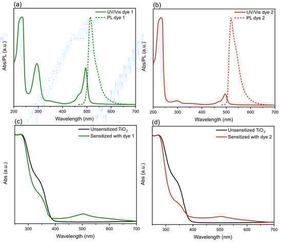 The absorption and PL emission spectra of solutions of bodipy dyes 1 and 2 are illustrated in Figure 1a,b. Both dyes exhibit three absorption features (more pronounced for dye 1 due to higher molar attenuation coefficients (ε) at those particular wavelengths—Table 1) with two located in the UV region and one in the visible (green) portion of the electromagnetic spectrum. From the absorption onset of the dyes, their band gap values were determined to be ≈ 2.4 eV (Table 1). Due to Stokes shift, where the position of the band maxima of the absorption was at ≈ 495 nm, the emission of the dyes resulted to be 514 nm for dye 1 and 520 nm for dye 2. The bodipy dyes were then used for PECs, by sensitizing TiO2 photoelectrodes in a dye solution and their corresponding UV/Vis spectra are shown in Figure 1c,d. To evaluate if the TiO2 photoelectrodes successfully absorbed the dyes, comparison was made to the untreated (unsensitized) TiO2 photoelectrodes. As can be seen in Figure 1c,d, both sensitized TiO2 photoelectrodes exhibited a broad absorption feature in the visible spectrum allowing the harvesting of more energy from photons. This can be attributed to the dye absorption (λmax at 502 and 504 nm for bodipy dyes 1 and 2, respectively). Compared to the bodipy solutions, sensitized TiO2 photoelectrodes exhibited a bathochromic shift that occurred as a result of the interaction, between the dye and TiO2 nanoparticles (suppression of H-aggregation). [] Moreover, to investigate the molecular packing of dye molecules [] X-Ray diffraction (XRD) was also performed. Supplementary Materials Figure S4 shows the XRD diffraction patterns for unsensitized and sensitized TiO2 photoelectrodes where no difference between the samples was observed.