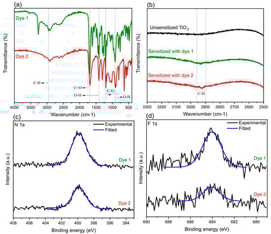 Fourier-transform infrared (FTIR) spectra of bodipy (a) dye 1 (green curve) and dye 2 (red curve) in a powder form along with the inset (b) of untreated (black curve) and sensitized TiO2 photoelectrodes on glass substrate. The whole range for the FTIR spectra of TiO2 photoelectrodes can be seen in Supplementary Materials Figure S5. The high-resolution (c) N 1s and (d) F 1s X-ray photoelectron spectroscopy (XPS) spectra for sensitized TiO2 photoelectrodes.
