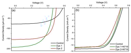 Photocurrent–voltage (J–V) characteristics of photoelectrochemical cells (PECs) sensitized only with (a) dye 1 and 2 including a control (unsensitized) together with (b) N719 co-sensitized. The control PEC in (b) was sensitized only with a dye N719.
