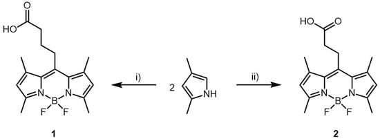 Synthetic routes towards bodipy dyes 1 and 2. (1) Succinic anhydride, dichloromethane (DCM), BF3·Et2O, reflux 5h, BF3·Et2O, TEA, 16 h. (2) Glutaric anhydride, DCM, BF3·Et2O, reflux 5h, BF3·Et2O, TEA, 16 h.