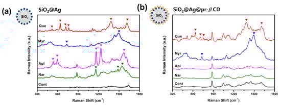 To confirm the effect of pr-β-CD on the surface of SiO2@Ag, Raman spectra of SiO2@Ag@pr-β-CD and SiO2@Ag reacted with flavonoids were investigated. Four flavonoids with a similar structure—i.e., Que, Myr, Api, and Nar—were used as target molecules. As shown in Figure 2a, the Raman spectra of the SiO2@Ag reacted with these flavonoids showed their intrinsic characteristic bands. Que exhibited unique peaks at 637, 718, 762, 1380, and 1614 cm−1, while Myr showed unique peaks at 734 and 1495 cm−1. The characteristic bands of Api were at 533, 594, 1164, 1235, and 1570 cm−1, and those of Nar were at 1160, 1484, and 1545 cm−1. On the other hand, the SiO2@Ag@pr-β-CD incubated with four flavonoids showed the characteristics of SERS bands of Que and Myr (Figure 2b). More specifically, Que-incubated SiO2@Ag@pr-β-CD and Myr-incubated SiO2@Ag@pr-β-CD showed their unique peaks, regardless of the presence or absence of pr-β-CDs on the SiO2@Ag surface, although the shapes were slightly different. However, Api- and Nar-incubated SiO2@Ag@pr-β-CD were not able to show their characteristic peaks, and their SERS bands were similar to those of the SiO2@Ag@pr-β-CD, as demonstrated in Figure 2b. Not only the number of OH groups but also the position of OH groups on the structure of flavonoids are very important for the formation of the host–guest complexes between β-CD ligand and flavonoids. The position and number of OHs in the flavonoids affects the value of the stability constant associated with the β-CD []. It is well known that Que forms the most stable host–guest complex with β-CD compared to other three flavonoids [,,,]. In particular, Myr has a lower stability constant with β-CDs than that of Api. However, Myr has many OH groups, and it is thought to be more attractive to β-CDs by OH groups and hydrogen bonds and van der Waals attraction on the β-CD surface in ethanol solution [,]. The findings imply that Api and Nar could not be absorbed on the surface of the SiO2@Ag@pr-β-CD and indicate that the presence of pr-β-CDs on the surface of SiO2@Ag could selectively capture specific flavonoids among others with a similar structure.