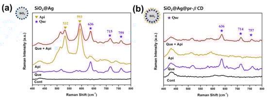 Next, we investigated the selectivity of the SiO2@Ag@pr-β-CDs for flavonoids. Three solutions were prepared (Api solution, Que solution, and their mixture solution), with each having an equal concentration. The solutions were mixed with SiO2@Ag and SiO2@Ag@pr-β-CDs, respectively, and the Raman spectra were measured. As can be seen in Figure 3, the SiO2@Ag in the mixture of Api and Que showed distinctive bands at 532, 593, 636 715, and 759 cm−1. The Raman peaks at 532 and 593 cm−1 were assigned to the characteristic peaks of Api, and the peaks at 636, 715, and 759 cm−1 to those of Que. In terms of SiO2@Ag@pr-β-CD, the Raman peaks of the Api and Que mixture were observed at 636, 714, and 757 cm−1, which are the characteristic peaks of Que. These peaks corresponded only to the characteristic peaks of Que. The results show that SiO2@Ag has potential for multiplex detection and that SiO2@Ag@pr-β-CD exhibits an ability to perform selective multiplex detection of specific targets.