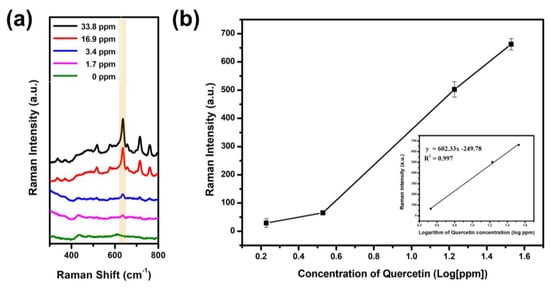 (a) Raman spectra of SiO2@Ag@pr-β-CD according to the concentration of Que and (b) its Raman intensity at 636 cm−1.