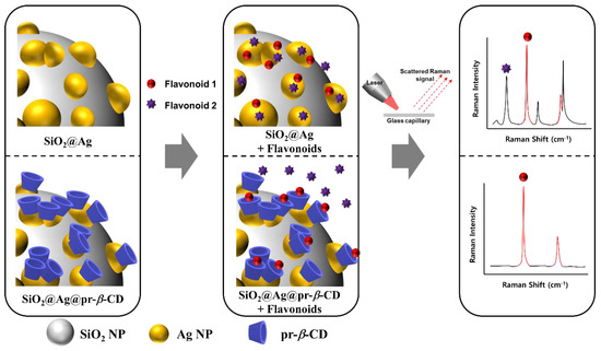 Schematic illustration of the effects of pr-β-CD on the surface of SiO2@Ag in selective flavonoid detection.