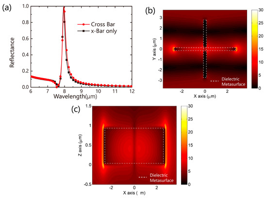 At first step, we studied the pure dielectric metasurface (without the metal film). As shown in Figure 2a, the reflection spectrum of the pure dielectric metasurface exhibits a high Q-factor peak with the period p = 7.5 μm, geometric parameters a = 5.5 μm and b = 0.3 μm. A Fano resonance(R1) appears at 7.97 μm. For the dielectric metasurface, it can be treated as a coupling mode between Mie scattering and Fabry–Pérot mode, where the different structure decides the specific transmission mode. At specific height (z axis), the metasurface can form a cavity (called resonance) at a specific wavelength band, while tuning the geometric parameters in x-y plane can compress the band into narrow. At this band, the electromagnetic wave almost reflects due to this cavity. Moreover, some special patterns can be treated as bound states in the continuum, which has an extremely narrow band resonance [28,29]. In our case, based on fruitful geometric freedom, the coupling mode can also be suppressed. The FWHM of the Fano resonance (R1) can reach 2.7% of the resonance wavelength (220 nm@7.98 μm). The electric field (E-field) distribution is shown in Figure 2b,c. The electric field is strongly located at the ends of the dielectric arm in the x-direction (x-Bar) as the incident light is x-polarized. We simulated the reflectance spectrum of the x-bar-only metasurface. Very similar Fano resonance is observed as shown in Figure 2a. It can be concluded that the cross-bar metasurface can offer polarization independent performance due to its 4-fold symmetry while linear polarization dependence is expected for the x-bar-only metasurface. It is noted that this kind of metasurface is incident angle-dependent, and the wavelength of the resonance works in ±5°.