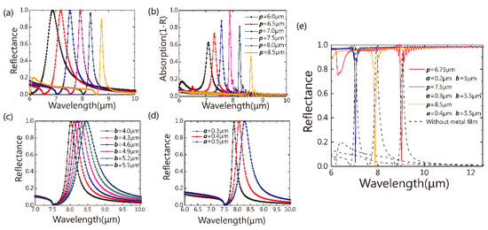 (a) The reflectance of the pure dielectric metasurface and (b) absorption of the hybrid metasurface (geometric parameters: a = 0.3 μm, b = 5.5 μm), while p varies from 6.0 μm to 8.5 μm; the reflectance spectra (c) of the pure dielectric metasurface (a = 0.5 μm, p = 7.5 μm), while b varies from 4.0 μm to 5.5 μm; the reflectance spectra(d) of the metasurface without gold film (b = 4.6 μm, p = 7.5 μm), while a varies from 0.3 μm to 0.5 μm; (e) the reflectance of the hybrid metasurface in different parameters (blue, orange and red solid lines) and their corresponding pure dielectric metasurface (black dotted lines).