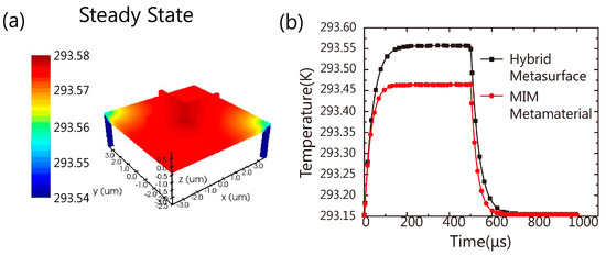 For this dielectric metasurface absorber, the required fabrication technique is CMOS compatible. It could be applied in many fields such as emitter [33,34], detector and sensing chips. It could be potentially integrated into infrared thermal detectors. By varying the geometry parameters of the metasurface, we can tune the center wavelength of the absorption dip and the ultranarrow bandwidth of the tip can lead to much better spectral resolution meeting the demands in many fields, such as thermal imaging and material detection. Here, we build a model to demonstrate that this hybrid dielectric metasurface can be integrated into thermal infrared detectors. We used the absorption in Figure 3d as the heat source to simulate thermal radiation and heat transfer. The vanadium oxide (VOx) detector is modelled after Du’s work [19,20]. Figure 5a shows the steady-state thermal distribution of the hybrid dielectric metasurface absorber. The temperature of the whole plane above the isolated thermal pillars can reach 293.55K, 0.4 degree higher than room temperature. Meanwhile, the transient state was also studied. As shown in Figure 5b, the temperature reaches the steady state (293.55K) in 151.37 μs. When the input power turns off, the temperature drops to room temperature in 154.15 μs. Moreover, we calculated the transient thermal state of a MIM absorber [30] that exhibits perfect absorption at 9.3 μm with FWHM 3 μm. With the same model of VOx detector structure and input intensity (absorbing energy), the steady temperature of the MIM absorber is 293.45 K. Both absorbers show similar response times to reach the steady state. Compared with the MIM absorber, the hybrid dielectric metasurface reaches 293.45 K faster and shows a higher steady-state temperature. As we discussed above, the absorption in MIM metamaterial happens in the metal structure in both sides of the dielectric layer. As usual, the dielectric layer has low thermal conductivity which means the heat generated in a metal disk cannot transfer down efficiently. In contrast, in our hybrid metasurface, most of the heat is generated in the plasmonic substrate film and can transfer to the VOx more efficiently.
