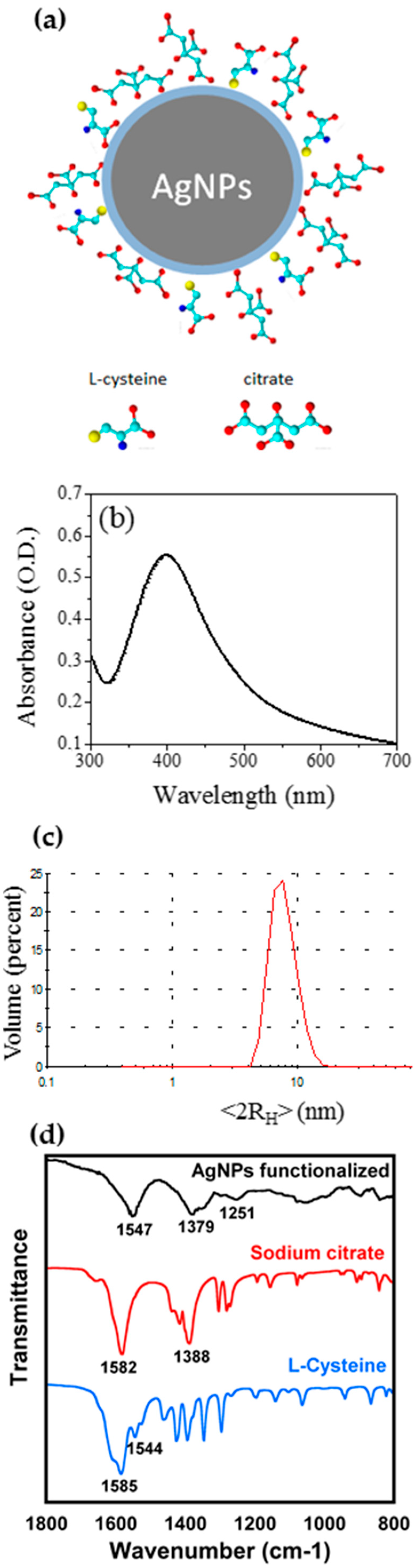 - Prosposito, P.; Mochi, F.; Ciotta, E.; Casalboni, M.; Venditti, I.; Fontana, L.; Testa, G.; Fratoddi, I. Hydrophilic silver nanoparticles with tunable optical properties: Application for the detection of heavy metals in water. Beilstein J. Nanotechnol. 2016, 7, 1654–1661. [Google Scholar] [CrossRef] [PubMed]
