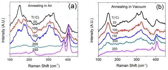 In order to reduce the measurement errors in Raman intensity, three spots were selected on each sample by a predefined mark so that the same spots were measured after each annealing step. Our results showed that post-annealed 1T MoS2 exhibited Raman features completely different from those of as-grown 1T MoS2 at room temperature. One can see from Figure 5a that the as-prepared 1T MoS2 (black trace) shows signature Raman peaks at 146 (J1) and 330 cm−1 (J3) for the metallic phase of MoS2. The broadening of A1g and E2g modes, as well as suppressed intensity of E2g are also typical to 1T phase. After annealing at 100 °C in air, the intensity of the peak at 146 cm−1 was significantly reduced while another peak at 378 cm−1 (E2g) was observed to emerge. The changes observed in Raman spectra upon annealing imply that samples were 1T-2H hybridized MoS2 at this stage. Following a further increase in the annealing temperature, the Raman peak due to the metallic phase gradually disappeared and the peaks at 378 (E2g) and 403 cm−1 (A1g) due to 2H MoS2 became stronger. Samples post-annealing treatment at 250 °C in air (magenta trace in Figure 5c) showed clear A1g and E2g vibrational modes corresponding to the 2H phase. The Raman spectra for the samples annealed in vacuum showed a similar trend as that found for the samples annealed in air. However, a slight difference is observed in terms of the peak intensity change, i.e., it changes faster in air than in vacuum. After annealing at 250 °C, the 1T MoS2 peak in the Raman spectra became difficult to observe while the 2H MoS2 peaks became significant. These experimental data clearly indicate that annealing at mild temperatures induces a transition in the MoS2 from the 1T to 2H phase, which explains the related property changes.