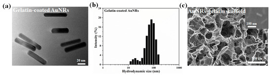 As shown in Figure 1a, the gelatin-coated gold nanoparticles had a rod-like structure with a nano-scaled dimension of 64.3 ± 3.4 nm × 14.1 ± 2.3 nm. The gelatin-coated AuNRs were uniformly distributed without aggregation. Moreover, the dynamic light scattering (DLS) results (Figure 1b) showed that the average hydrodynamic size of gelatin-coated AuNRs dispersed in water was 69.8 ± 7.5 nm and the polydispersity index (PDI) was 0.295 ± 0.020, which indicated the gelatin-coated AuNRs had a narrow size distribution and good monodispersity in water. The gelatin-coated AuNRs were introduced in gelatin sponge to prepare AuNRs-gelatin composite porous scaffold. SEM observation (Figure 1c) showed the porous structure of the composite scaffold. The composite scaffold showed homogenously distributed spherical large pores with good interconnectivity. Magnified images (insert in Figure 1c) displayed that AuNRs were embedded into the gelatin matrices and homogeneously distributed on the pore walls of the composite scaffold without aggregation.