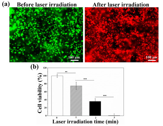 3.3. Photothermal Ablation of Tumor Cells Cultured in AuNRs–Gelatin Composite Porous Scaffold