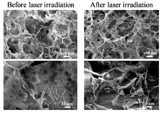 SEM images (Figure 4) showed that, before laser irradiation, the breast tumor cells were homogenously distributed throughout the AuNRs–gelatin composite scaffold. Magnified images showed the tumor cells attached and spread well on the walls of pores in the composite scaffolds. After NIR laser irradiation, the ablated tumor cells still remained on the pore walls of the composite scaffolds.