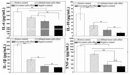 Secretion level of IL-6, IL-10, IL-1β and TNF-α by dendritic cells (DCs) after being co-cultured with living 4T1-Luc cells and photothermally ablated 4T1-Luc cells in the AuNRs-gelatin composite porous scaffold. Positive and negative controls are DCs cultured in the composite scaffolds with and without LPS, respectively. The data represent the means ± S.D. (n = 3). No significant difference: N.S.; significant difference: * p < 0.05; ** p < 0.01; *** p < 0.001.