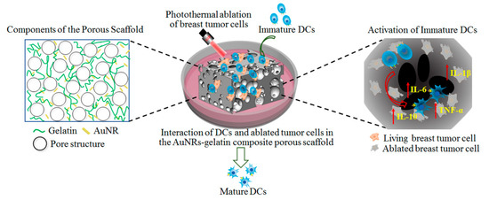Illustration of the interaction of dendritic cells (DCs) and photothermally ablated tumor cells in gold nanorod-gelatin composite porous scaffolds.