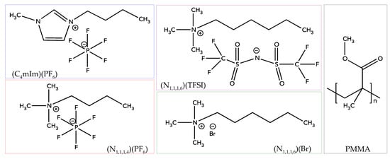 Chemical structures of ionic liquids (ILs) considered in this study. PMMA, poly(methyl methacrylate); TFSI, bis(trifluoromethanesulfonyl)imide; PF6, hexafluorophosphate; Br, Bromide.