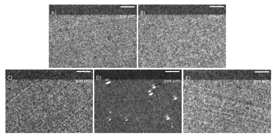 TEM micrographs of neat PMMA and IL-modified PMMA materials: (A) neat PMMA; (B) PMMA/(C4mIm)(PF6); (C) PMMA/(N1,1,1,4)(PF6); (D) PMMA/(N1,1,1,6)(Br); and (E) PMMA/(N1,1,1,6)(TFSI) (2 wt.% IL).