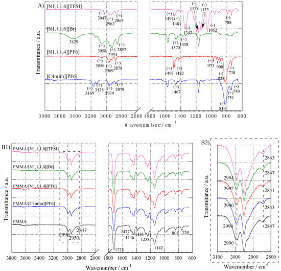 FTIR spectra of: (A) neat imidazolium and ammonium-based ILs, (+) and (−) captions highlight the main absorption bands for the cation and anion, respectively; (B1) neat PMMA and IL-modified PMMA materials; and (B2) displays the same spectra ranging only from 3100 to 2800 cm−1).