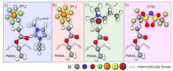Based on FTIR and DSC analyses, the respective interactions between PMMA and ILs can be summarized as reported in Figure 4. (As no interactions between PMMA and ammonium cations occur, the structures of (N1,1,1,4)+ and (N1,1,1,6)+ for (N1,1,1,4)(PF6) and (N1,1,1,6)(TFSI) ionic liquids are not represented.) On the other hand, (N1,1,1,6)(Br) is represented as a ion pair to highlight its poor interactions with PMMA.