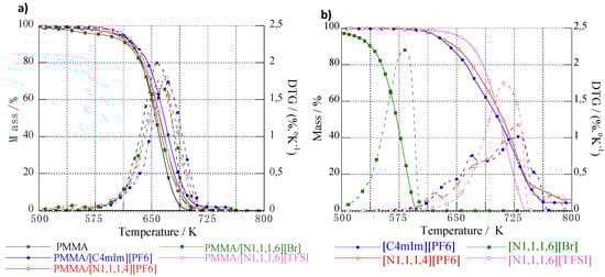 The Tg of PMMA remains the same after the addition of (N1,1,1,6)(TFSI) ionic liquid, whereas a decrease was noticed for the other IL-modified PMMA materials. As expected from the conclusions on the poor interactions of (N1,1,1,6)(TFSI) with PMMA, no plasticization occurred [24]. In the opposite, the incorporation of ILs such as (N1,1,1,4)(PF6) and (N1,1,1,6)(Br)− into PMMA led to a slight decrease of the Tg (4 °C). Comparing the cation structures, it is evident that the acid hydrogen of the imidazolium ring (N = CH − N) can interact with the carboxyl group, enhancing the compatibility between the IL and polymer matrix. On the other hand, the Tg for PMMA/(C4mIm)(PF6) decreased about 7 °C compared to PMMA because of the specific interactions between PMMA and both (C4mIm)+ and (PF6)−, which compete with the intermolecular interactions between the polymer chains. As previously mentioned, many works described the use of ILs as plasticizing agents of polymer materials, especially because of their similar characteristics to conventional plasticizers, such as low volatility, low leachability, high temperature stability, and compatibility with polymers [43,55]. Moreover, ideal plasticizers possess a solvating group located internally rather than as terminal groups. Thereby, the charged structures of ILs are not much different [37].