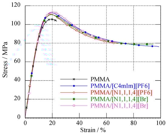 Strain–stress curves in uniaxial tension for neat PMMA and IL-modified PMMA materials (295 K, 50% RH, 2 mm·min−1).