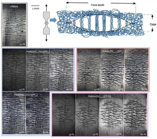 It is known that the appearance and growth of crazes is an efficient phenomenon for toughening thermoplastics. In fact, craze growth plays a key role by absorbing energy from surface creation and chain pull out during the deformation process [74,75,76,77]. Thus, the generation of numerous nucleation sites of crazing enhances the amount of energy absorbed and contributes efficiently to the material toughness by delaying fracture. It is also well known that by enhancing the chain mobility, usually by increasing temperature, crazing initiation and the extension of the internal fibrils from chain pull out are facilitated [74,75]. It was previously demonstrated that ILs lead to a decrease in the intermolecular interactions between polymer chains. In fact, the presence of ILs delays the strain at which the first crazes appear. Observable crazes appeared at 20% of strain for neat PMMA, whereas 30% of strain must be reached for (N1,1,1,6)(Br)- and (N1,1,1,6)(TFSI)-modified PMMA and 40% for (C4mIm)(PF6)- and (N1,1,1,4)(PF6)-modified PMMA.