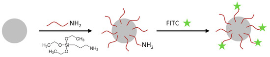 Cartoon of the functionalization procedure of SiO2 nanoparticles. SiO2-NPs were functionalized with APTES to obtain reactive amino groups. In the next step, 5(6)-carboxyfluorescein N-hydroxysuccinimide ester (FITC) was conjugated to some amino groups (FITC-SiO2-NPs).
