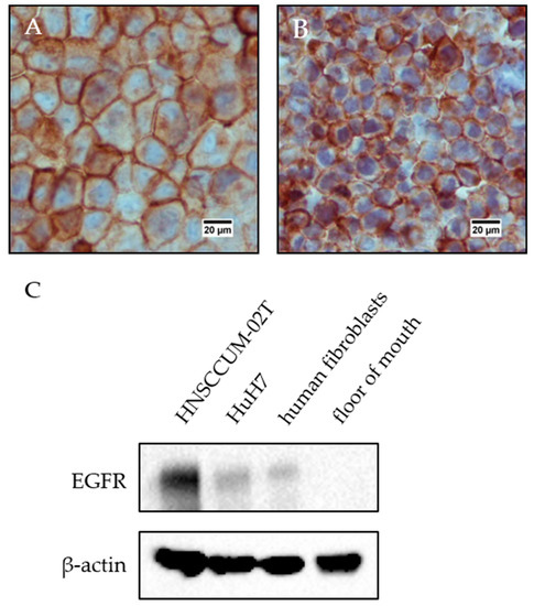 EGFR expression in HNSCCUM-02T and HuH7 cells. (A) HNSCCUM-02T cells and (B) HuH7 cells highly express EGFR. (C) Immunoblot analysis revealed high EGFR expression in HNSCCUM-02T cells and weak EGFR expression in HuH7 cells and primary human fibroblasts as well. In contrast, no EGFR expression was detected in a floor of mouth sample.