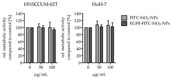 Biocompatibility of FITC-SiO2-NPs and EGFR-FITC-SiO2-NPs. 50 µg/mL and 100 µg/mL FITC-SiO2-NPs and EGFR-FITC-SiO2-NPs did not reduce the viability of HNSCCUM-02T and HuH7 cell lines after 24 h incubation, respectively. Mean + S.D., n.s., n = 3.