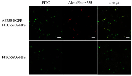 The antibody coupling efficiency was determined with an Alexa Fluor® 555-labeled EGFR-antibody (AF555-EGFR-Ab). The fluorescence of Alexa Fluor® 555 after antibody conjugation was normalized to the fluorescence of FITC to evaluate the coupling efficiency. The quotient of the fluorescence of AF555 and FITC was significantly greater (2.9-fold) for AF555-EGFR-FITC-SiO2-NPs than for FITC-SiO2-NPs, indicating a successful antibody conjugation, as shown in Figure 5.