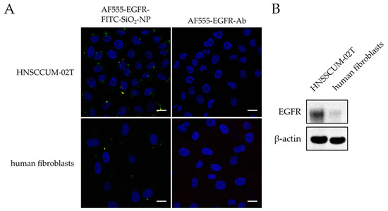 Comparison of AF555-EGFR-FITC-SiO2-NPs and AF555-EGFR-Ab immunostaining in HNSCCUM-02T and human fibroblasts. (A) HNSCCUM-02T cells and primary human fibroblasts were incubated with 100 µg/mL AF555-EGFR-FITC-SiO2-NPs or the corresponding amount of AF555-EGFR-Ab for 30 min at 37 °C. Then, the cells were washed, fixed, and embedded in DAPI-containing mounting medium. The nuclei are shown in blue, the FITC-SiO2-NPs in green, the AF555-EGFR-Ab in red, and the co-localization in yellow. More AF555-EGFR-FITC-SiO2-NPs attached to the cellular membranes of HNSCCUM-02T cells than primary human fibroblasts. The AF555-EGFR-Ab alone did not stain the cells. Thus, FITC-SiO2-NPs are required for contrast enhancement and antibody-conjugation improved the specificity. Scale: 20 µm. (B) Immunoblot analysis of EGFR expression in HNSCCUM-02T cells and primary human fibroblasts. HNSCCUM-02T cells express much more EGFR than the used primary human fibroblasts. β-Actin was used as the loading control.