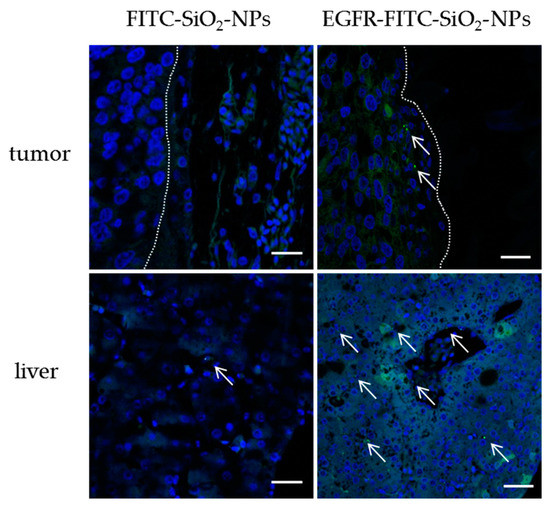 FITC-SiO2-NPs and EGFR-FITC-SiO2-NPs in vivo distribution. 50 µL of 1 mg/mL FITC-SiO2-NPs in 0.9% NaCl or EGFR-FITC-SiO2-NPs in 20% ethanol/80% 0.9% NaCl were injected into the CAM and chicken embryos were incubated for 24 h, respectively. The CAM with tumor and the liver were removed, fixed and processed for paraffin sectioning. The paraffin sections were stained with DAPI. Nuclei are shown in blue and FITC-labeled nanoparticles in green (arrows). A dotted line indicates the tumor border; the tumor is on the left. EGFR-FITC-SiO2-NPs were found occasionally in the tumor and often in the liver. FITC-SiO2-NPs could be rarely detected in the liver. Scale: 20 µm.