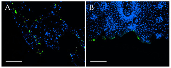 EGFR-FITC-SiO2-NP binding ex vivo. Fluorescence images of (A) oropharynx carcinoma and (B) healthy gingiva samples after incubation with EGFR-FITC-SiO2-NPs for two minutes. EGFR-FITC-SiO2-NPs are depicted in green, nuclei in blue. EGFR-FITC-SiO2-NPs attached preferably to tumor tissue while only few EGFR-FITC-SiO2-NPs bound to healthy tissue. Representative images are shown. Scale: 50 µm.