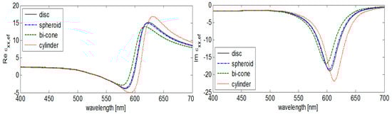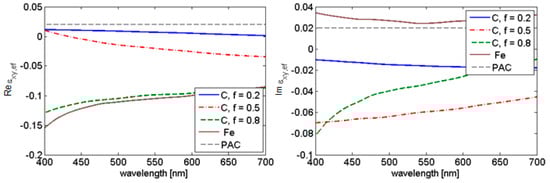 The most conspicuous response is again observed for cylindrical nanoparticles in agreement with the previous result. This fact is demonstrated by tensor component εxy in Figure 3 for the iron nanoparticles in polyacrylate by varying the fill factor. Optical functions of Fe and PAC (polyacrylate) are in [,], respectively.