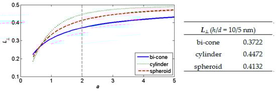 predominates in Equation (4), therefore, we meet its resolved form in numerous practical applications. Derivation of this term can be proved in several ways [,,]. This integral does not depend on the volume, but rather on the geometrical shape of the particle. The results are well-known for current nanoparticle shapes [,,] when these are axially and centrically symmetric.