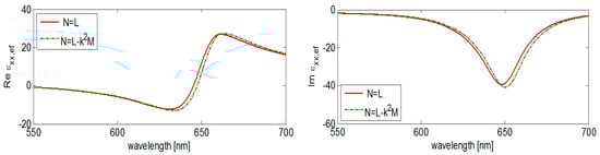The electric dipoles induced in metal nanoparticles by external fields strongly modify the optical function of plasmonic materials (e.g., Au, Ag) that is in the visible optical region manifested through the resonance peaks of the effective permittivity. In the Figure 4, we observe this effect close to the wavelength corresponding to the localized plasmon excitation []. The optical function of gold and the data for permittivity off-diagonal terms are adopted from References [,].