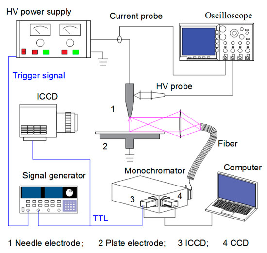 Figure 1 shows the schematic diagram of the experimental setup. The plasma reactor consists of a needle electrode with the curvature radius of 0.4 mm, and a grounded circular plate electrode covered by a 1 mm thick ceramic plate. The discharge is driven by a nanosecond pulsed power supply. Voltage probe (Tektronix- P6015A, Tektronix Inc, Beaverton, OR, USA) and current probe (Pearson Current Monitor-4100, Pearson Electronics Inc, Palo Alto, CA, USA) are used to measure the waveforms of pulse voltage and discharge current, which are displayed and recorded by an oscilloscope (Tektronix-TDS5054B-500 MHz, Tektronix Inc, Beaverton, OR, USA). The optical emission spectra are obtained using multichannel optical fibers and collected by a grating monochromator (Andor SR-750i, grating groove 2400 lines/mm, glancing wavelength 300 nm, Andor Technology Inc, Belfast, UK). A conjugate spectrum image system is used to acquire the spatially resolved optical spectra, where the heads of 35 parallel fibers are closely arranged in the vertical image plane of the quartz lens (f = 75 mm). After the diffraction of the grating, the output spectral light can be transformed into a digital signal by an intensified charge-coupled device (ICCD) camera (Andor’s iStar DH334T, Andor Technology Inc, Belfast, UK). For the time-resolved measurements, the ICCD camera is synchronized with the pulsed voltage.